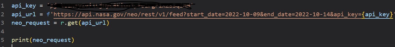 Below you can see how I used my API key and the requests package to bring in some data about astroids that have approached earth recently